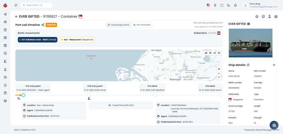 Expected arrivals, berth plans, agents, and PCS metadata enhance the raw AIS.