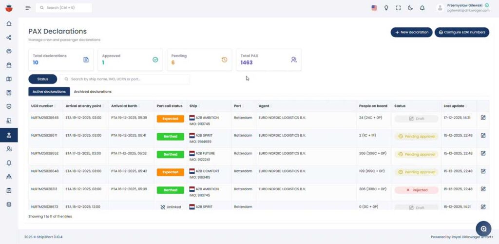 Whether you start from the map, port call list, or fleet overview, PAX declarations are always connected to the latest voyage and port information — so all parties work from the same declaration, without confusion or duplicate submissions.